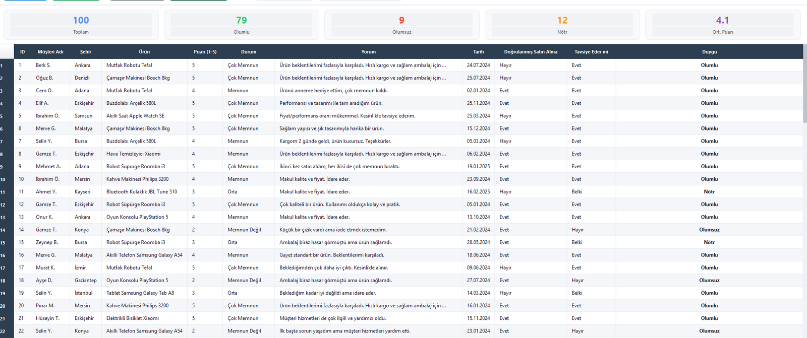 Ne işe yarar? Yorum puanını (1–5 yıldız) ve yorum metnini birlikte analiz ederek her satırı Olumlu, Olumsuz veya Nötr olarak etiketler. “Harika ürün ama kargo berbattı” gibi karmaşık cümlelerdeki olumsuzlama ve pekiştirme kalıplarını da tanır.