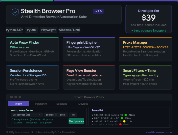 Stealth Browser Pro is a powerful Python/PyQt6 desktop application that automates anti-detection browsing with real-time fingerprint spoofing, SOCKS5/HTTP proxy rotation, and an integrated auto-proxy finder that pulls fresh IPs from 15 free sources in seconds. Built for developers and automation engineers who need undetectable, session-persistent web automation at scale. Includes a dark-themed GUI, device profile manager, keyword warmer, page-view booster, and proxy health checker — all in one offline-ready desktop tool.